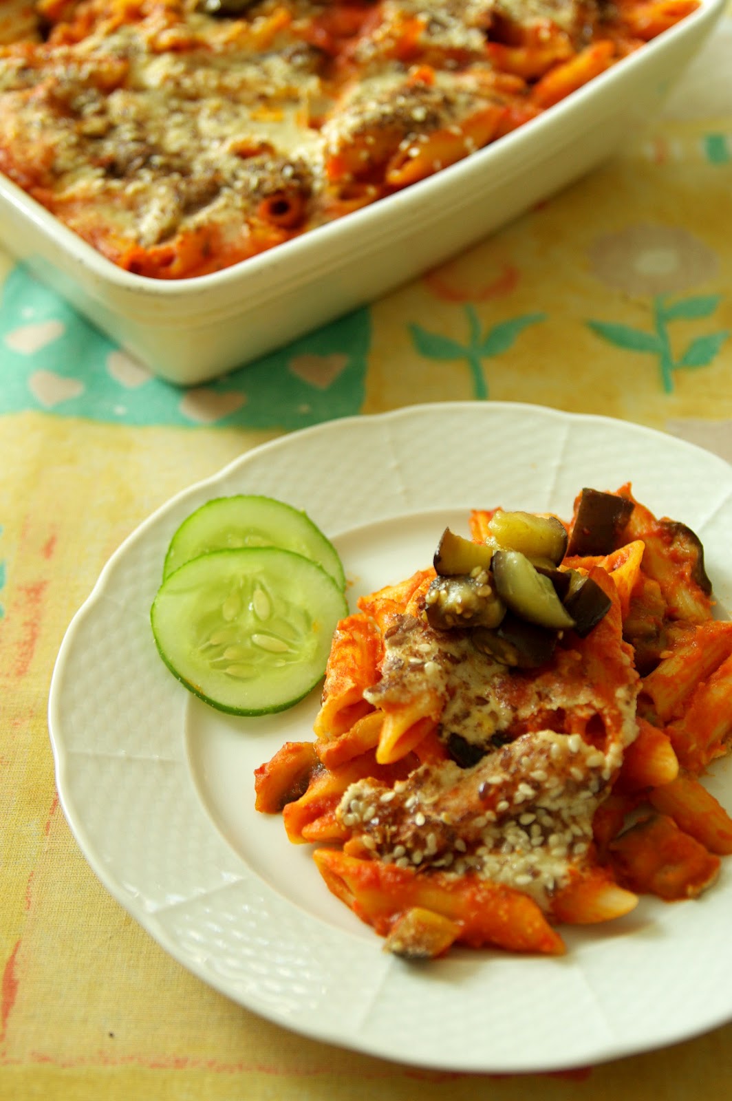 A durumtésztát kifőzzük. A padlizsánt alaposan megmossuk és felkockázzuk. Nem kell meghámozni, a héjában van az igazi ereje 🙂 (Mi nagyon szeretjük a padlizsánhéj ízt :-). Egy tepsit kiolajozunk, és beletesszük a felkockázott padlizsánokat és megszórjuk fokhagymagranulátummal. Alaposan összepirítjuk.