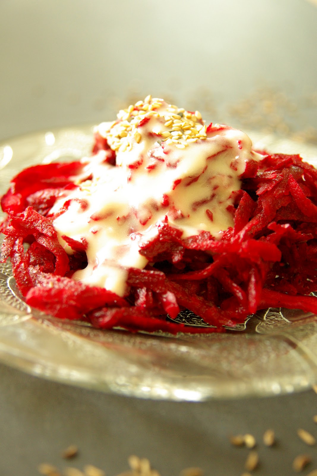 A céklát megmostam, meghámoztam és lereszeltem.  Besóztam, köménymaggal ízesítettem, és beletettem az apróra vágott lilahagymát is. Közben elkészítettem az öntetet is: a babot és levét elkezdtem turmixolna (botmixerrel), közben kevertem hozzá a sót, citromot, olajat, mustárt. Sűrű, majonézre emlékeztető ízű és állagú öntetet kaptam. Ezt öntöttük fogyasztás előtt a céklára, szezámmaggal dúsítottam.