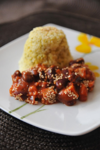 Igazi téli egytálétel. Igaz, férjemnek és kislányomnak a ragut tésztával együtt tepsiben összesütve készítettem el, de én kölessel fogyasztottam.