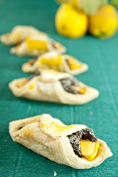 Szóval amíg kiolvadt a tészta, mákot daráltam, majd kukoricatejjel és barna cukorral, citromhéjjal sűrűre főztem. Közben birsalmát szeleteltem (héjastul!). A tésztát kinyújtottam, majd kis kockákat vágtam belőle, a kockák közepére tettem alulra birsalmát, majd a mákos masszából, ill. és két részről felhajtottam a tésztát. Olaj, méz és és kurkuma keverékével kentem meg, a sütik két végeire is tettem birsalmát. Kb.20 perc alatt közepes lángon sült ki.