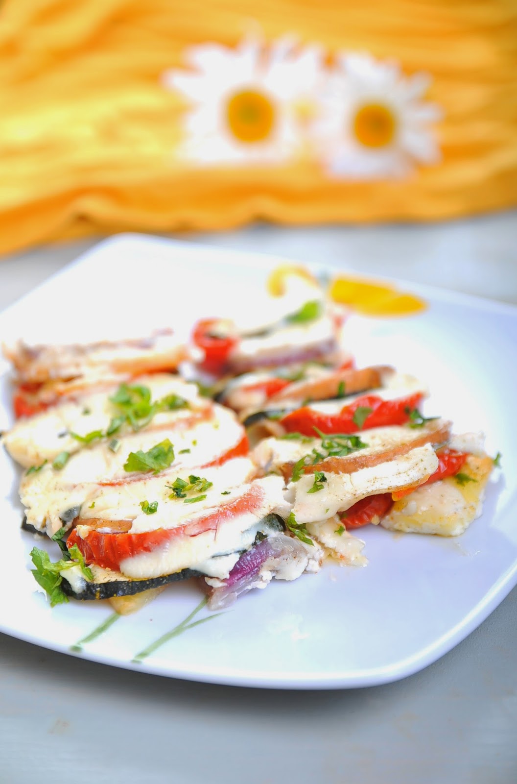 A zöldségeket megmossuk, és felkarikázzuk – a burgonyát és a lilahagymát a legvékonyabban, majd a cukkinit és paradicsomot kicsit vastagabbra. Egy tepsit kiolajozunk, beletesszük a zöldségeket: egy krumplikarikát, majd paradicsomot, cukkinit, lilahagymát, és ezt addig ismételjük, amíg el nem fogynak a zöldségek. A szójadresszingbe belekeverjük a sajtkrémet (Violife Creamy) és ezzel meglocsoljuk az egészet. Megszórjuk petrezselyemzölddel és 200 fokon kb. 30-40 perc alatt összesütjük.