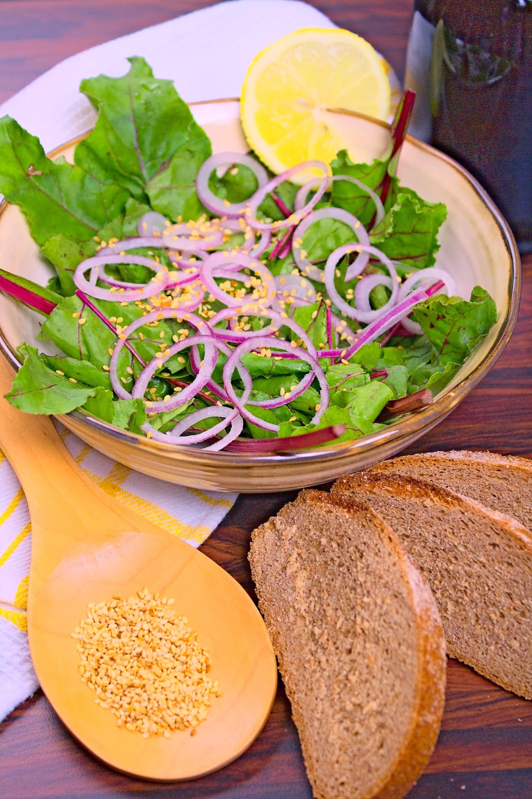 A céklaleveleket megmossuk, majd kisebb részekre szaggatjuk, vagy vágjuk. A metélőhagymát összevágjuk és a céklalevelekhez adjuk. Az olajból, mézből, citromból és vízből öntetet készítünk, és a salátára öntjük. Szezámmaggal dúsítjuk. Frissen fogyasztjuk.