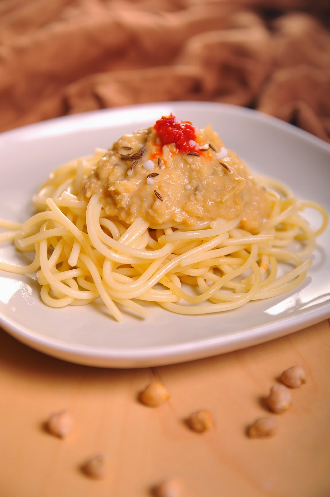 A fokhagymát megpucoljuk, lereszeljük és olívaolaj és ugyanannyi víz keverékén megpároljuk. Hozzáadjuk a megfőtt és összeturmixolt csicseriborsót, a dresszinget, és ízesítjük római köménnyel, korianderrel, ételízesítővel, sóval.