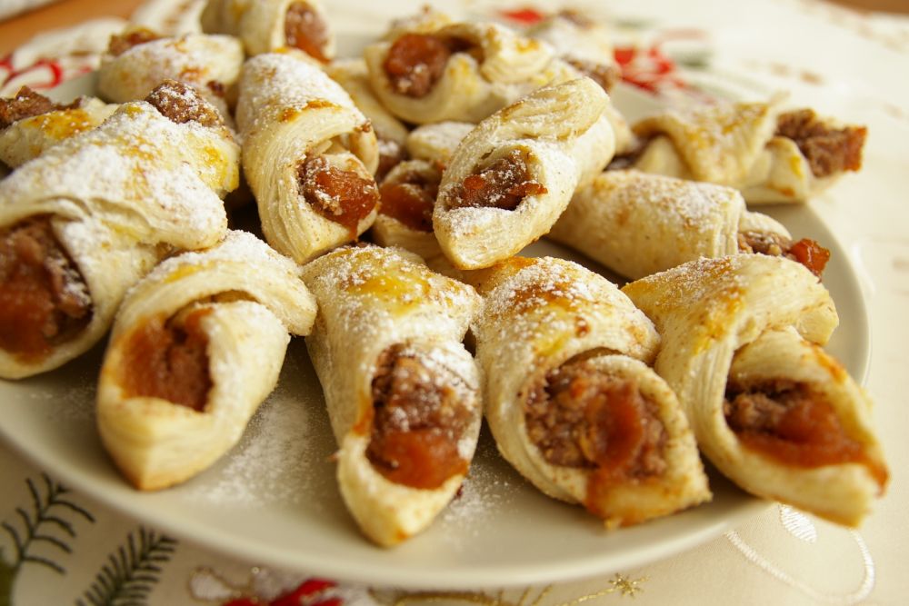 Így ma kb. 5 perc alatt a dióhoz öntöttem kukoricatejet, mazsolát és mézet, ill. reszelt almát is tettem hozzá,  keményebb massza lett, és „felrottyantottam”. Miközben rottyant egyet, kinyújtottam a tésztát (teljes kiőrlésű lisztet tettem alá és fölé is, így ez is kicsit került bele), és nagy csíkokra, majd ezeket kis kockákra vágtam. A kockák közepére tettem a diós masszát, és két oldalról ráhajtottam a tésztát. A szélére is raktam almát. Betettem a sütőbe, és kb. 20 perc múlva kivettem (közepes lángon sült). 30 db lett belőle.