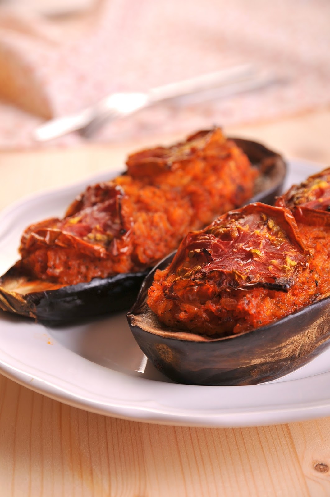A rizst kétszeres vízben kifőzzük. A hagymát 2 ek. és ugyanannyi olaj és víz keverékén megpároljuk, hozzákeverjük a nyersen lereszelt sárgarépát, a megdarált diót, a lestyánt, és az előzőleg vízbe áztatott lenmagot (ez tartja össze). Pirospaprikával színezzük, és sóval ízesítjük. Majd egy tepsit kiolajozunk, a padlizsánokat megmossuk, megtöröljük és a belsejüket kivájva  megtöltjük őket. Mindegyik tetejére 2-2 karika paradicsomot teszünk. Ezt követően beletesszük a kiolajozott tepsibe és 180 fokon összesütjük. Friss salátával fogyasztjuk.