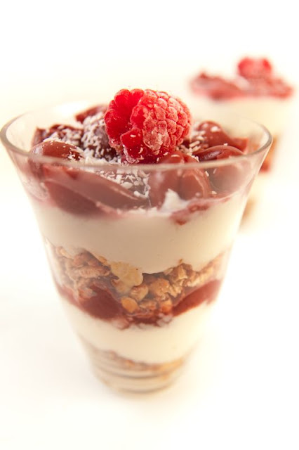 Azért csak félig tavasz, mert még nincs friss idénygyümölcs, „csak” kompóttal készült a rétegezett reggeli 🙂 Egyrészt az ebédhez is készült kesutejföl (ld. itt), így egyszerűen ebbe kevertem mézet, kókuszt. Ezek után így készült a rétegezés:
