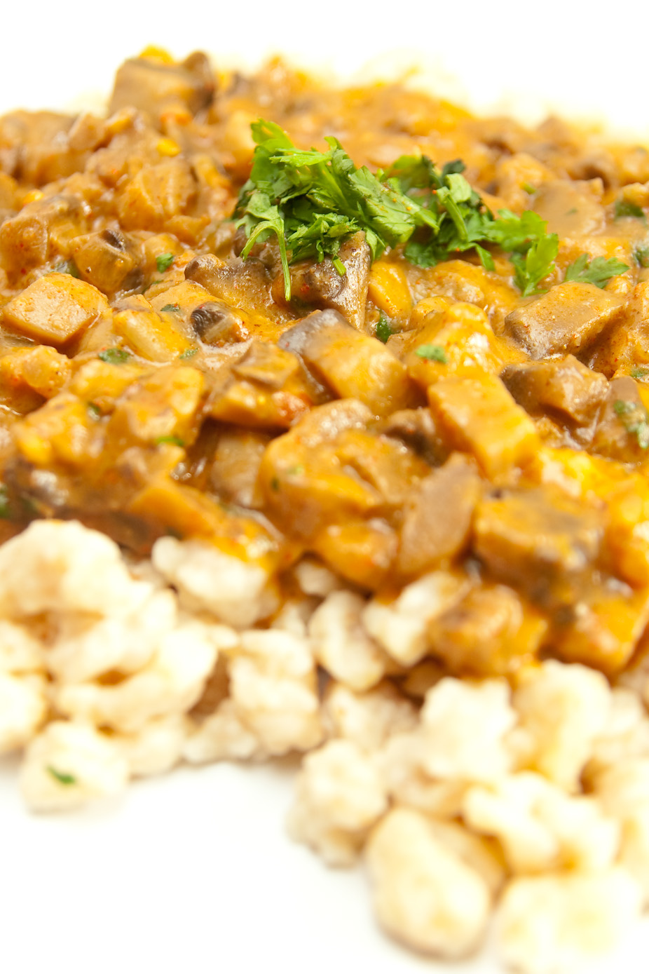 Kifőztem korpás nokedlit (fele adag zabpehelyliszt, fele adag simaliszt + korpa+ víz +só), és közben elkészítettem a gombapaprikás alapját: 5 hagymát pároltam vízen, megpucoltam és rusztikusan felvágtam a gombát. Majd a megpárolódott hagymára rátettem. Víz nem került alá, mert a gomba sok vizet ereszt. Került viszont kömény, majoranna, só és egy kis őrölt mustármag. Amikor majdnem megpuhult a gomba, pirospaprikát is szórtam, illetve olajat öntöttem rá. Ezzel együtt még főztem, majd amikor teljesen megpuhult, kesudióból és vízből kesutejfölt készítettem, egy kis (egy tk.) teljes kiőrlésű lisztet tettem bele, és petrezselymet. Kb. még 5 percig főztem, és lezártam.