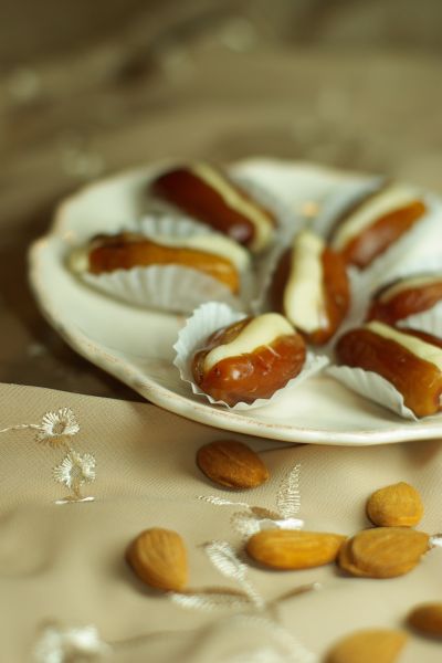 A marcipánhoz a mandulát forrásban lévő vízbe tesszük, 2-3 percig, majd könnyedén lehúzzuk róla a héját. Ezt turmix-szal iszonyatosan elturmixoljuk a mandulát 🙂 A cukorból és vízből/mézből szirupot készítünk, amelyet ráöntünk az elturmixolt mandulára. Folpackb-a tesszük a marcipánt, és állni hagyjuk. Eközben a datolyákat hosszában félbevágjuk. A már keményedő marcipánból lecsippentünk, kis csíkokat formálunk, és ezeket beletesszük a datolyákba.