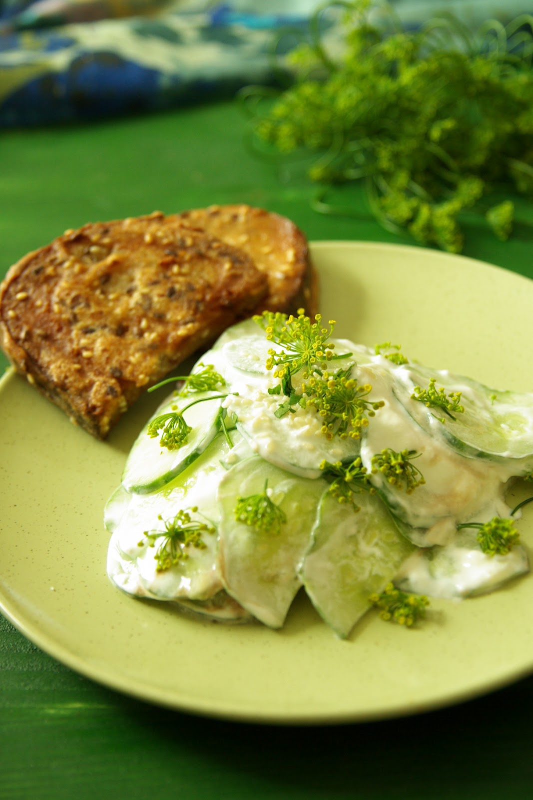 Ismét egy saláta, de hát most van itt a szezonja.  A kaporvirág felhasználása Nagy Zsuzsától származik (legalábbis én tőle hallottam, amikor A nyár ízei könyv számára készített egy nagyon pazar salátát, kaporvirággal). A könyvről hamarosan írok 🙂 Szóval tegnap Gábor barátunktól kaptunk kaporvirágot, uborkát pedig Rékától kaptunk, akinek a nagymamája két utcára tőlünk lakik, és kertje csupa finomságot rejt magában.:-) Így ezzel a két hozzávalóval ma én is kísérleteztem.