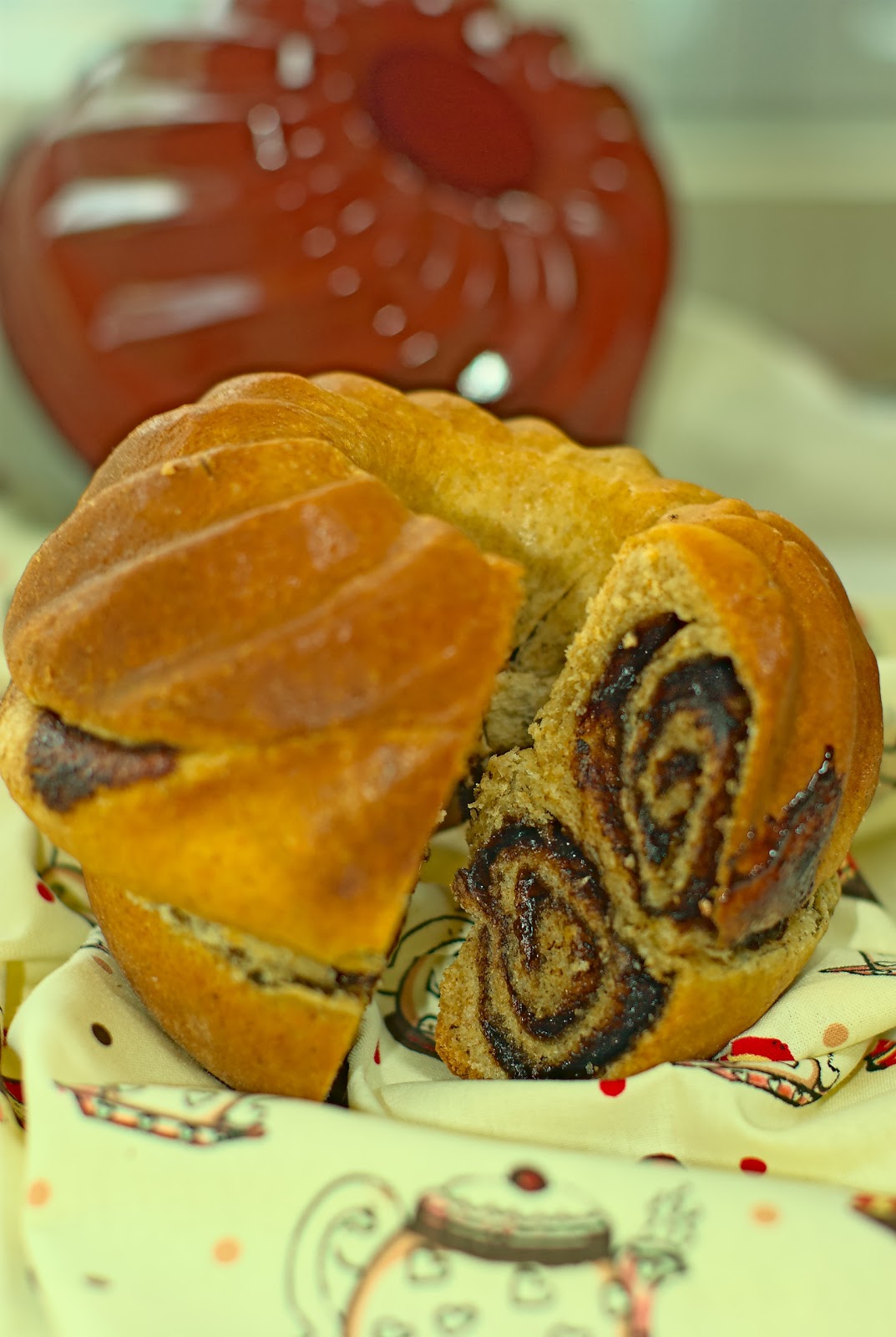 A kukoricatejet meglangyosítottam, elkevertem benne a mézet, és az élesztőt felfuttattam. A lisztet, az élesztőt és a maradék vizet lágy tésztává gyúrtam, ízesítettem vaníliával és citromhéjjal. Egy órán át letakarva kelesztettem, majd 2 részre vettem és kinyújtottam mindkét tésztát, olajjal megkentem, és erre szórtam a cukros karobot. A két fonatot olajozott, lisztezett kuglófformába tettem, mézes kukoricatejjel lekentem. 35-40 perc alatt megsült, kb. 170 fokon.
