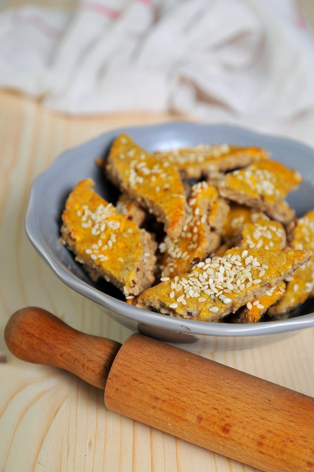 A liszteket összekeverjük, hozzáadjuk a sütőport, a magvakat, az olajat, és fokozatosan a vizet. Amikor jól nyújtható tészta lesz, lisztezett tepsin kinyújtjuk, csíkokra vágjuk, majd azokat rombusz alakú kisebb részekre, majd kurkumás, áttört fokhagymás olajjal megkenjük, szezámmaggal megszórjuk. 200 fokon 20 perc alatt megsütjük.