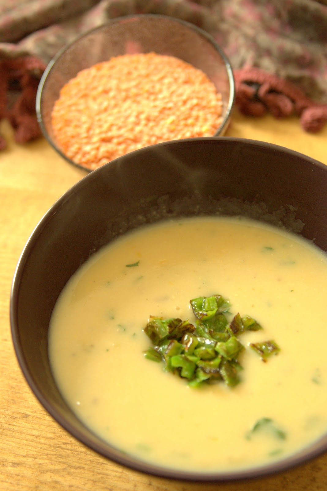 A vöröshagymát apróra vágjuk, majd vízen megpároljuk. Rákockázzuk a meghámozott krumplit, az átmosott vöröslencsét. Felengedjük kb.1 l vízzel. Sózzuk, köménymaggal, fokhagymával ízesítjük. Puhára főzzük. Ekkor hozzáöntjük a rizstejszínt és botmixerrel krémesre zúzzuk. Olajat belelocsolva összefőzzük. A felvágott koriandert a végén keverjük hozzá. A pritaminpaprikát apró kockákra vágjuk, és kevés olívaolajjal kikent tepsiben megpirítjuk. Ezt szórjuk a levesünkbe, tálalás előtt.