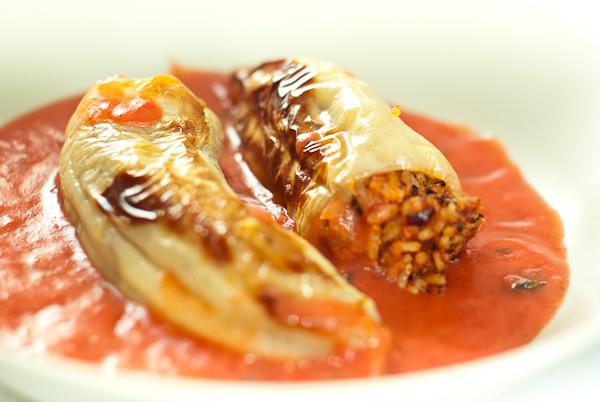 Kevés vízen megpároltam az apróra vágott hagymát, majd belekevertem a magokat (darált dió, napraforgó, és a szezámmag), a lenmagot megdaráltam és beáztattam, amikor „nyúlós lett”, akkor került bele a masszába (tojás helyett), ill. fűszereztem, sóztam, fokhagymáztam, petrezselyemmel ízesítettem, és a rizst belekevertem. Kevés olajat öntöttem hozzá. Megtöltöttem a paprikákat, és vékonyan kiolajozott tepsibe tettem mindet, és alaposan megsütöttem (magas tűz mellett, kb. 20-30 perc alatt). Nagyon finom magában is (férjem így szereti), én egy kis paradicsomszószt is készítettem, feltettem még 1/2 liter tavaly eltett paradicsomlevet, ebbe kevertem bele 4 ek. teljes kiőrlésű lisztet, olajat, sót, mézet, zellert, és összefőztem. 🙂