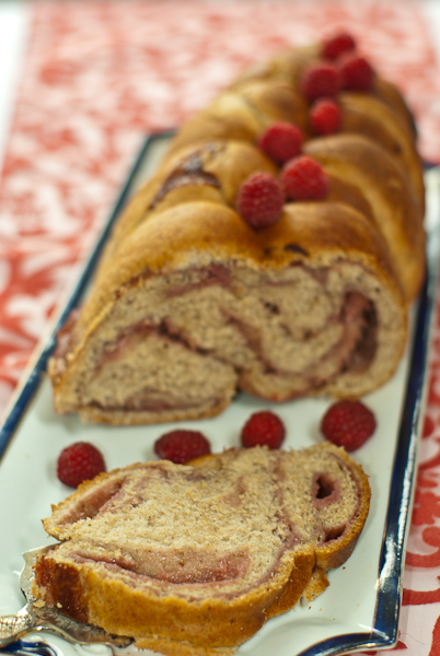 Az elmorzsolt élesztőt a kézmeleg, mézes italban, 1 evőkanál mézzel és 1 evőkanál olajjal felfuttatjuk. A liszteket az olajjal, a sóval, az egészen apróra lereszelt főtt krumplival és a citromhéjjal elmorzsoljuk, majd decinként hozzáadjuk először a felfuttatott élesztőt, és ha a tészta még igényli annyi meleg tejet, hogy kemény, de rugalmas tésztát kapjunk. Kb. 15 percig dagasszuk. A végén 4 evőkanál mézzel még kenjük be az összeállt tésztát majd 1 óráig meleg helyen, letakarva vagy kelesztő tálban kelesszük, félidőben egyszer átgyúrva. Turmixoljuk össze a krém alapanyagait. Amikor a tésztánk megkelt, nyújtsuk ½ ujjnyi vastag 50 cm hosszú téglalap formára és kenjük el rajta egyenletesen a málnakrémet. Hosszában vágjuk 3 csíkra, melyeket a hosszabbik felüknél fogva tekerjünk fel. Az így keletkezett 3 rudat fonjuk össze és egy kiolajozott, kilisztezett őzgerinc formába rakjuk bele. Tegyük sütőbe és 150 fokra véve a hőmérsékletet süssük 30-40 percig (tűpróbával) a málnás kalácsot. Tálalhatjuk a fonott felével felfelé, ahogy a képen is látható, de az őzgerinces felével felfelé is.