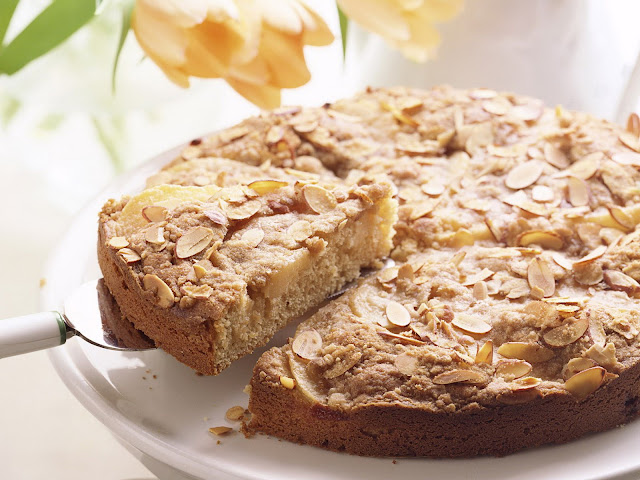 A cukrot és a lisztet, sütőport, kávét összekeverjük. Majd ebbe öntjük bele a nedves alapanyagokat: az olajat, növényi tejet. Majd egy kiolajozott és lisztezett tepsibe töltjük, és a meghámozott körtét rászeleteljük , megszórjuk mandulaszeletekkel. Közepes lángon, 30 perc alatt kisütjük.
