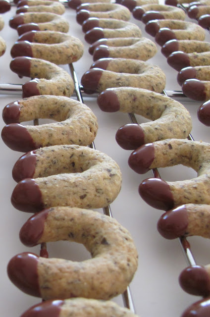 A megolvasztott kókuszzsírt kikeverjük a cukorral, majd hozzáadjuk sütőport, a liszteket, a darált mandulát, és összegyúrjuk. Hűtőben 30 percig pihentetjük. Majd ujjnyi rudakat sodorunk a tésztából, és patkó alakúra formázzuk. Sütőpapírral bélelt tepsibe tesszük és kisütjük. Eközben elkészítjük az „öntetet”: alaposan összekeverjük a hozzávalókat. Legvégül a patkók végeit az öntetbe mártogatjuk.