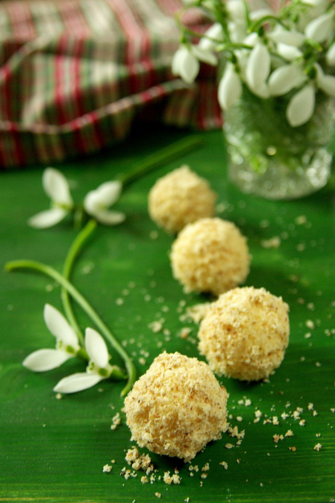 A vízből és a nyírfacukorból szirupot főzünk, és langyosra kihűtjük. Ehhez hozzákeverjük a kókusztejport, a kókuszolajat, és 15 dkg kókuszreszeléket. Ne ijedjünk meg, a massza nagyon puha lesz, hiszen a kókuszolaj a meleg hatására folyós lesz. Az elkészült masszát tegyük hűtőbe, amíg a kókuszolaj megdermed, majd vizes kézzel kis golyókat formázzunk, úgy, hogy mandulát tegyünk a közepébe és a ledarált (héjas) mandulareszelékbe forgassuk meg. Lehűtve tálaljuk.