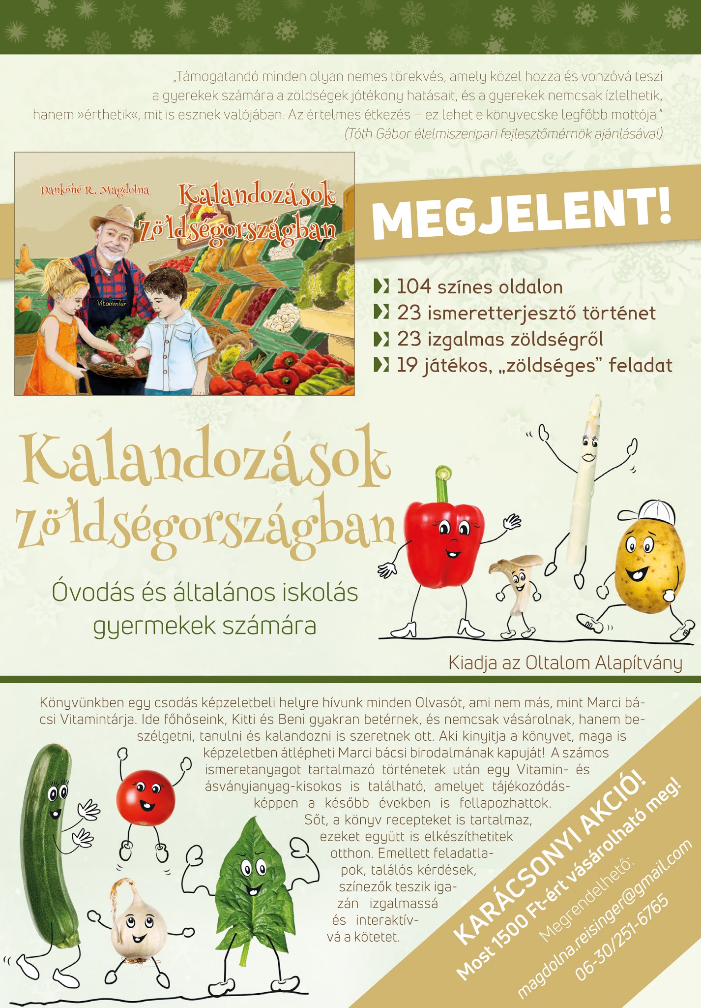 104 oldalon 23 zöldség-történet, 19 feladatlap és rengeteg színes zöldség-grafika, fotó, receptek, találós kérdések találhatók benne. A mellékelt szórólapon látjátok, hol kell rendelni. Karácsonyra szép ajándék lehet. 🙂