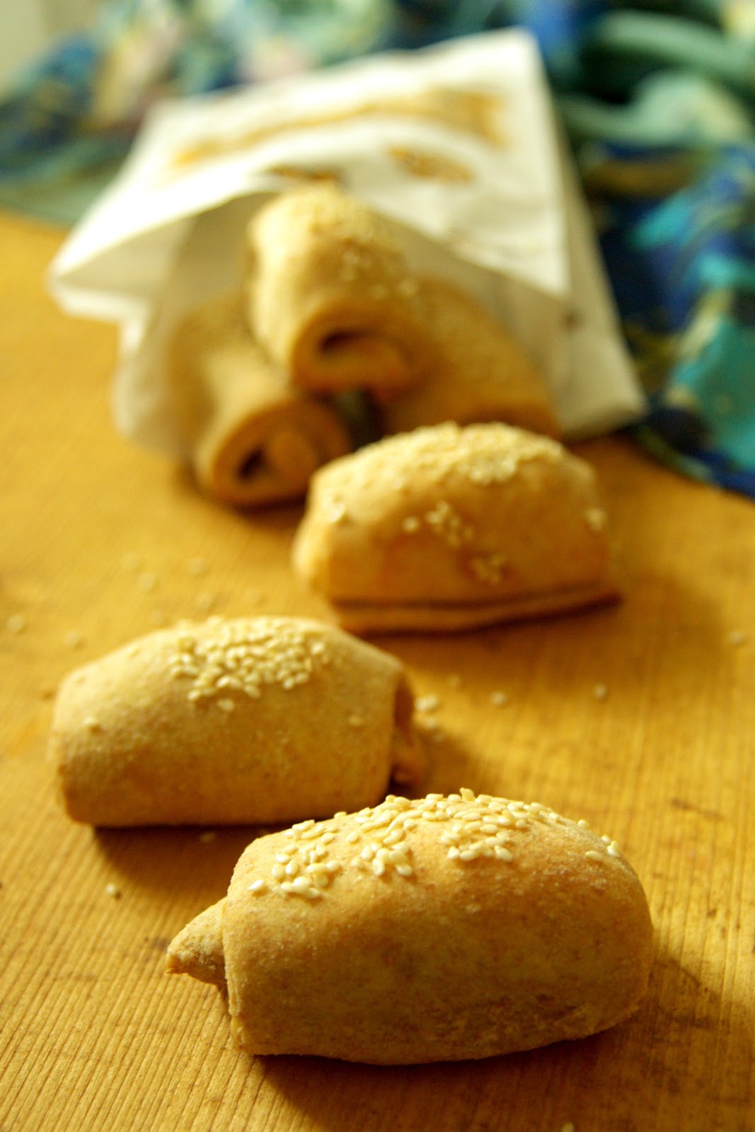 Az élesztőt 1 dl langyos mézes vízben felfuttatjuk. A liszteket összekeverjük, sózzuk, belemérjük az olajat, a maradék langyos vizet és a felfutott élesztőt. Bedagasztjuk a tésztát, majd 1 órát meleg helyen kelesztjük. Eközben a tofut téglalap alakú adagokra felvágjuk. Majd lisztezett deszkán félujjnyi vastagságúra nyújtjuka tésztát, melyekből téglalapokat vágunk. Mindegyiket megkenjük mustárral, majd a tetejére tesszük a tofurudat, és felcsavarjuk. Olajjal kenjük meg mindegyik tetejét, ill. megszórjuk szezámmaggal. Olajozott, lisztezett tepsibe téve 170 fokon 25 perc alatt kisütjük.