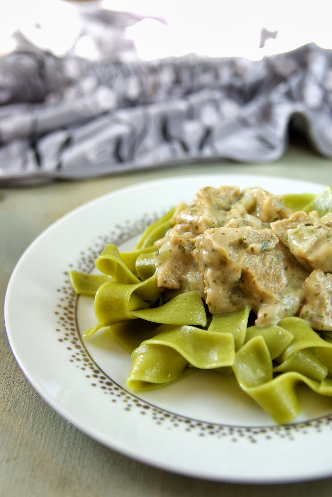 A búzahúst a szokott módon elkészítjük. Majd a hagymákat meghámozzuk, felkockázzuk és olaj és víz keverékén megpároljuk. A keményítőt 3-4 ek. vízzel elkeverjük. A búzahúst csíkokra vágjuk, és rátesszük a megpárolódott hagymára. Megsózzuk. Hozzáadjuk a vízben feloldott keményítőt, a szójatejszínt, a mustárt és a felaprított petrezselymet. Összefőzzük és tésztával tálaljuk.