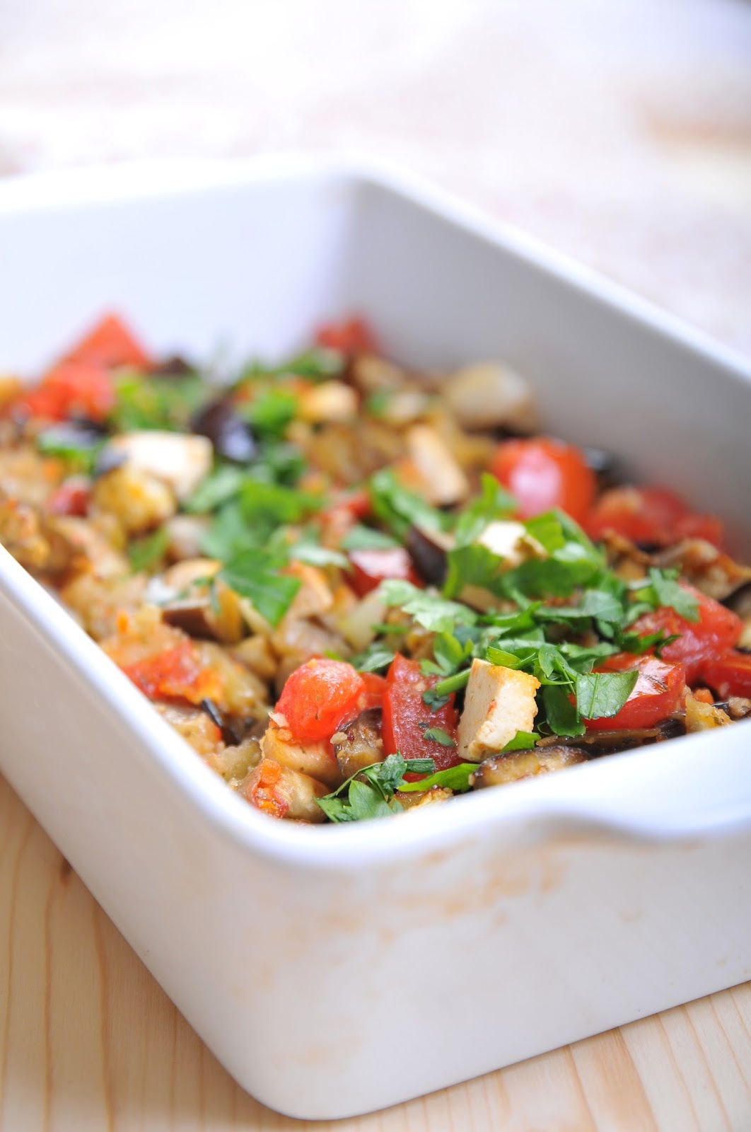 A padlizsánt, paradicsomot, fokhagymát, tofut felkockázzuk. Egy tepsit meglocsolunk olajjal, beletesszük a padlizsánt és a paradicsomot, majd megszórjuk a fűszerekkel. 200 fokon 15 perc alarr félkészre sütjük, ekkor adjuk hozzá a fokhagymát, tofut. Még 10 percig sütjük. A végén megszórjuk felaprított petrezselyem zölddel. Pirítós mellé, vagy rizshez, krumplihoz is tálalhatjuk.
