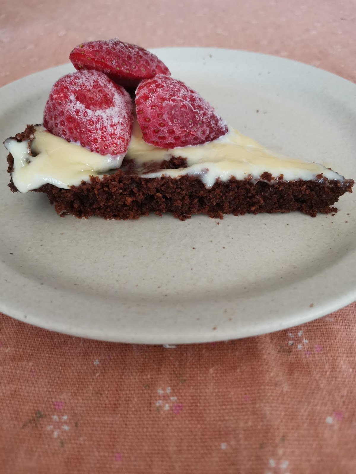 A datolyát egy éjszakára beáztatjuk. Majd az áztatólével (kb 0,5 dl) együtt turmixgépbe tesszük, és simára turmixoljuk. Hozzáadjuk a mandulalisztet, a kakaóport, és az édesítőt. Hűtőformába tesszük és 2 órára hűtőbe tesszük. Eközben elkészítjük az ebédet, játszunk egy nagyot a gyerekekkel és a pudingot is elkészítjük. Ráöntjük a felszeletelt süteményre, és eperrel díszítjük.