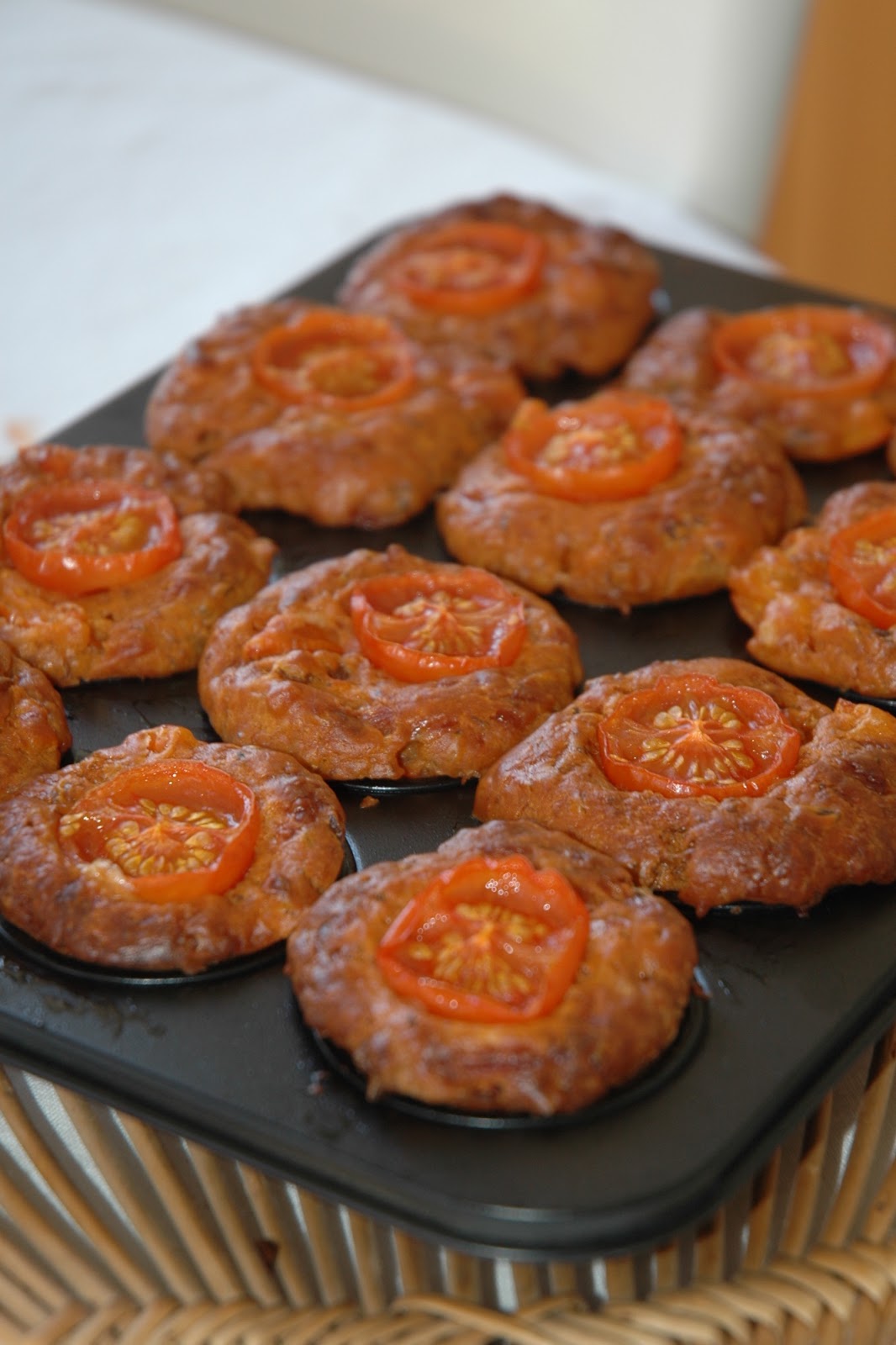 A liszteket elkeverjük a sütőporral, oregano-val, sóval majd vízzel és az olajjal tésztává gyúrjuk. 12 részre vesszük és kör alakúra nyújtjuk. A szósz hozzávalóit összekeverjük, a sajtot felkockázzuk. Minden kör közepére teszünk a szószból 1 evőkanálnyit és 1 db sajtkockát. Összecsomagoljuk és olajozott, lisztezett formába tesszük. Tetejére paradicsomot téve 180 fokon 25-30 perc alatt készre sütjük.
