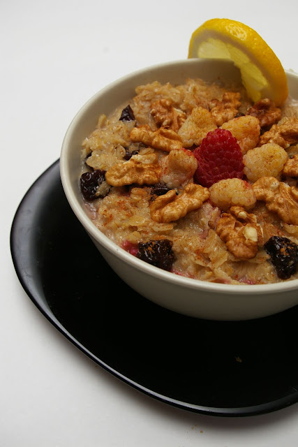Kb. 3 dl vizet tettem fel főni, kukoricatejjel (de jó bármilyen más növényi tej por is), mézzel, aszalt meggyel (ezt egy másik kedves ismerősünktől kaptuk:), kókusszal, és kicsi karobbal. Amikor forrt, kb. 2 dl zabpelyhet szórtam bele, és addig főztem, míg fel nem szívta a zabpehely a vizet, ill. meg nem puhult. A végén tettem bele a felolvasztott málnákat, hiszen az gyorsan széteshet. Melegen ettük, finom volt és jó sok energiát adoltt a napra, ilyenkor egy ideig nem vagyunk éhesek. A gabonák (most zabpehely) mellé érdemes olajos magvakat enni, mert így a legteljesebb az értékük, remekül kiegészítik egymást, segítik testünk működését :)).