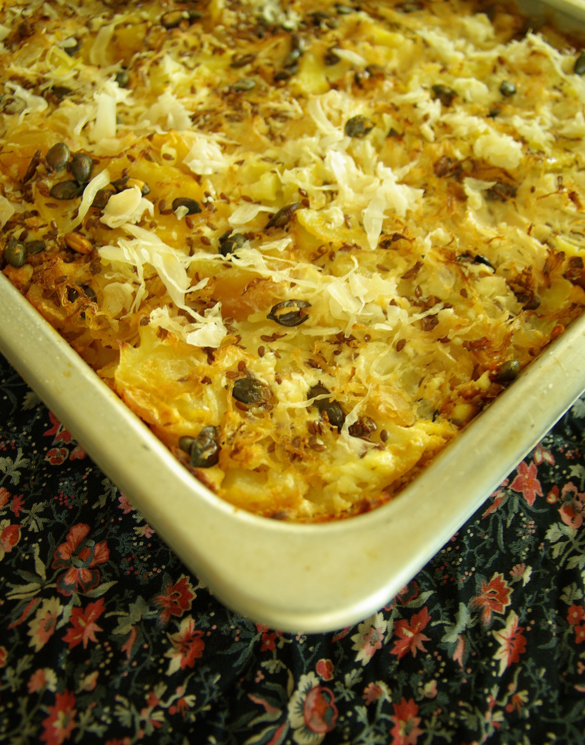A krumplit megfőzzük, lehűtjük és meghámozzuk. Egy tepsit kiolajozunk, rávágunk egy sor krumplit, sózzuk, gabonakolbászt aprítunk rá, majd feldarabolt savanyú káposztával megszórjuk. Erre öntjük az előzőleg elkészített növényi tejfölt, amelyhez a füstölt tofut, sörélesztőpelyhet, vizet, napraforgómagot és olajat homogénre turmixoljuk. Majd olajjal meglocsoljuk az ételünket és újabb sor krumpli és savanyú káposzta következik. Sózzuk, majd ráöntjük a maradék növényi tejfölt. Olaj a tetejére is kerül, majd közepes lángon összesütjük. A tetejére még pirított tökmagot tettem, mert nagyon szeretjük. 🙂