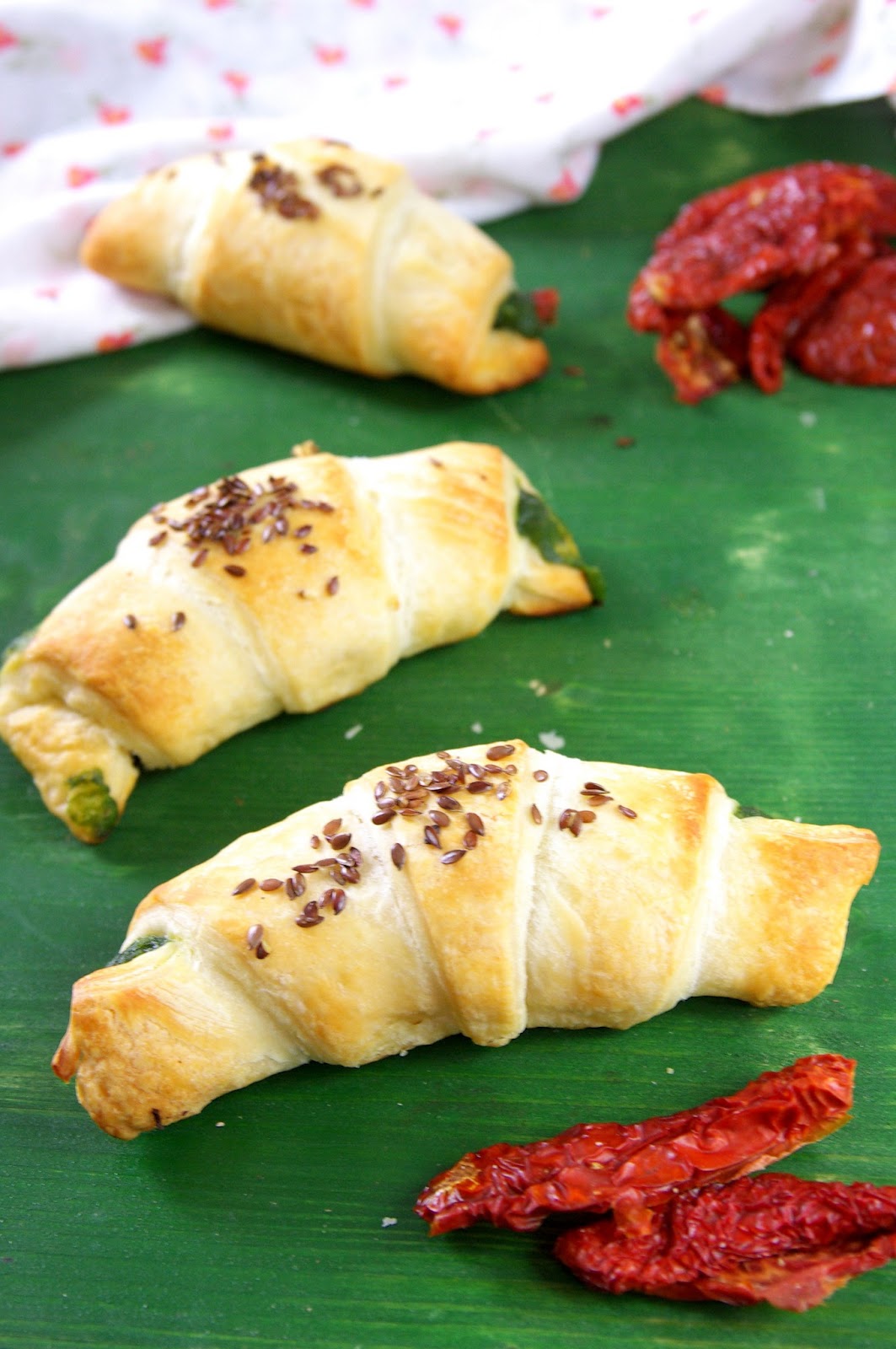 A croissant tésztát kicsomagoljuk, a megadott vágás mentén elvágjuk. A spenótot előkészítjük: először a lisztet száraz edényben megpirítjuk, majd ekkor hozzáadjuk a kiengedett spenótot, lisztet, fokhagymát, olajat, sót. Összefőzzük, majd ha szükséges, botmixerezzük. A kifliháromszögek szélesebb részére 1-1 ek. spenótot teszünk, ill. a felkockázott tofut és paradicsomot is. A háromszög vékony végét bevizezzük, majd feltekerjük. A kifliket sütőpapíros tepsibe tesszük, tetejüket olajjal megkenjük, megszórjuk magvakkal és 170-180 fokon 15-18 perc alatt készre sütjük.