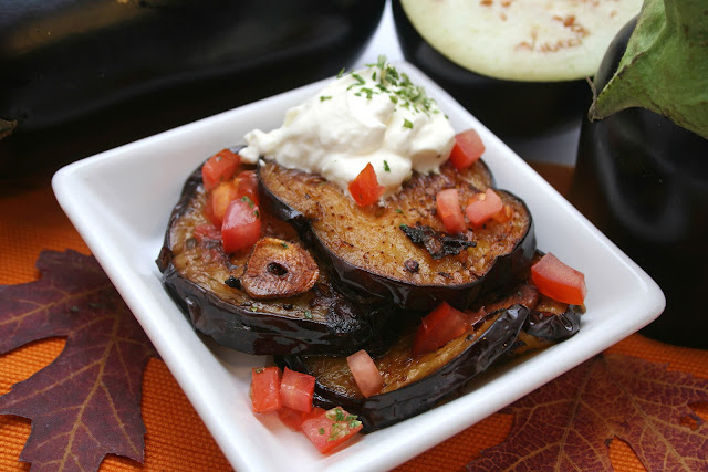 A padlizsánokat megmossuk, felkarikázzuk és olajjal kikent tepsibe téve megsózzuk; és mindkét oldalukat megsütjük (150 fokon, kb. 10-10 perc alatt). A fokhagymát meghámozzuk és felkarikázzuk. Akkor szórjuk rá a padlizsánra, amikor a szeleteket megforgatjuk. Eközben egyrészt felkockázzuk a paradicsomokat; felvágjuk a petrezselyemzöldet; és elkészítjük az öntetet is. Ezt így készítjük el: a szójajoghurtba belekeverjük a citromlevet, sót, sörélesztőpelyhet, és a petrezselyemzöldet. Az Alpro natúr joghurt is kicsit édeskés, de szerintünk citromlével, sóval ízesítve finom sós ételekbe is.