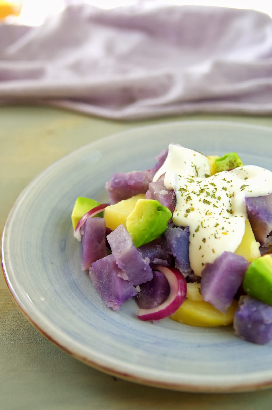 A burgonyát héjastul megfőzzük. Az avokádót meghámozzuk és felkockázzuk. A lila hagymát is hámozást követően felkockázzuk. A burgonyát, miután megfőtt s kihűlt, meghámozzuk és felkockázzuk. Mindezt egy tálba tesszük.