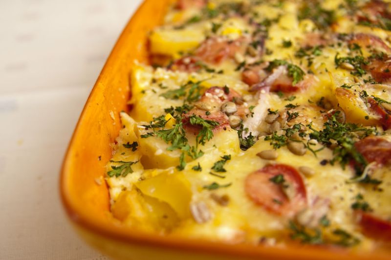 A romániai szójavirsli került az ebédbe is. Megfőztem kb. 2 kg krumplit, meghámoztam, felvágtam, majd olajozott tepsibe karikáztam. Tettem rá 1/2 doboz kukoricakonzervet, sót, hagymát és 3 felkarikázott virslit. Majd tejfölt (otthon kesutejföllel készítettem volna), olajat, és mindezt még egyszer megismételtem, és kisütöttem. 🙂 Gyors, egyszerű, olcsó, finom 🙂