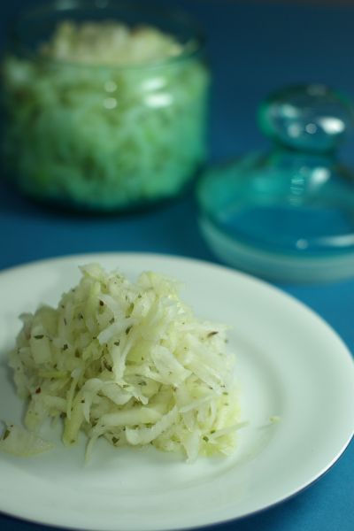 A karalábékat meghámoztam, és nagy lyukú reszelőn lereszeltem. A hagymát is meghámoztam, és apróra vágtam, hozzákevertem a karalábéhoz. Ekkor besóztam, fűszereztem. Tálalás előtt került rá az olívaolaj és a száraz serpenyőben pirított (és előtte összevágott) dió.