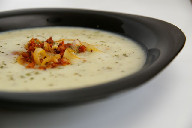 Három „óriás”, felkockázott krumplit vízben megfőztem, tettem bele egy fej hagymát, fokhagymát köménymagot, sót és tárkonyt. Megfőztem, majd került bele növényi tejszín (zabtejszín), még egy kis tárkony, olaj. Összebotmixereztem. Közben tepsiben lilahagymát gabonakolbásszal egy kis olívaolajon megpirítottam, és ezt tettük bele, kenyérkocka helyett. A pizzát később írom le, most rohanok. 🙂