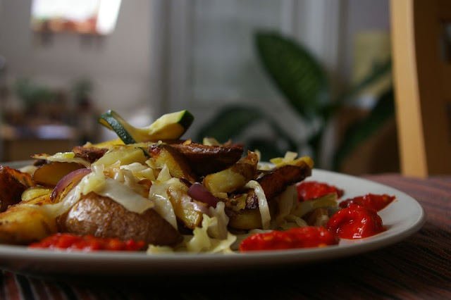 A krumplit héjastul megfőztem (félpuhára), majd egy nagy tepsibe olivaolajat öntöttem, és rusztikusan belevágtam (hosszúkás szeletekben) a héjas krumplikat, megszórtam sóval és friss rozmaringgal, egész köménymaggal. Betettem a sütőbe legmagasabb fokon sülni. Eközben kb. 1/2 kisebb káposztát és 1 fej lilahagymát vékony csíkokra vágtam, és kis vízen köménymaggal, sóval megdinszteltem, a végén tettem bele olajat is.