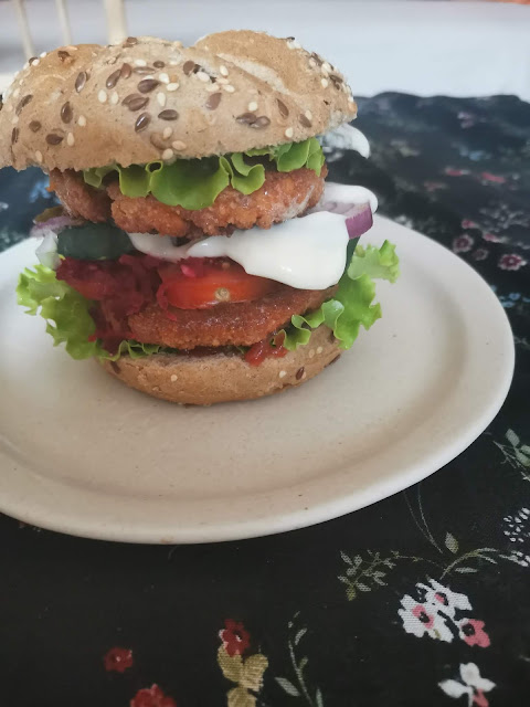 Hamburgert ettünk volna, de nem volt időm bucit is sütni, így most egy császárzsemlébe rejtettük a finom tofuból készült fasírtot, illetve zöldségeket. Így most csak a „hamburger „nem”hús” receptjét osztom meg veletek.