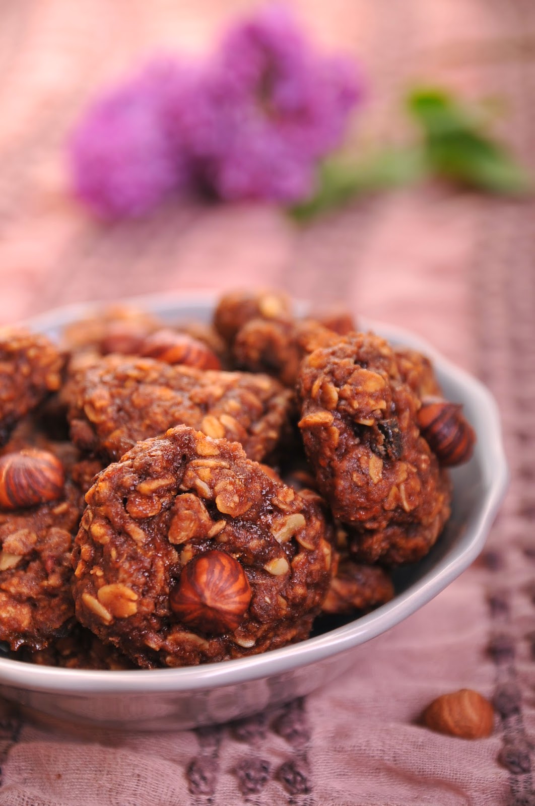A lisztet, a kókuszvirág cukrot, a foszfátmentes sütőport és a zabpelyhet és a karobot összekeverjük. Majd hozzáadjuk a mazsolát, a durvára vágott mogyorót, az olívaolajat, mézet, a két lereszelt almát, citromhéjat. Alaposan összedolgozzuk, majd kis gombócokat formázunk, közepükbe teszünk a marcipánmasszából, majd olajjal, liszttel kikent tepsibe teszünk. Mindegyik tetejébe helyezünk egy-egy mogyorót. Előmelegített sütőben 180 fokon kb. 20 perc alatt kisütjük.