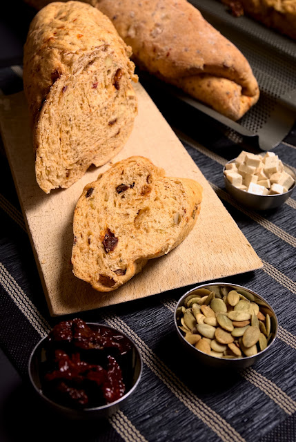 A mézes langyos vizet öntsük egy befőttes üvegbe, morzsoljuk bele az élesztőt. Alaposan rázzuk össze, és meleg helyen futtassuk fel az élesztőt. Reszeljük le sajtreszelőn a főtt burgonyát, és morzsoljuk el az olajjal, a lisztek kel és a sóval. A habos élesztőt öntsük hozzá, tegyük bele a kis kockákra vágott tofut és aszalt paradicsomot, valamint a durvára vágott, pirított tökmagot. Jó alaposan dolgozzuk ki kemény, de rugalmas