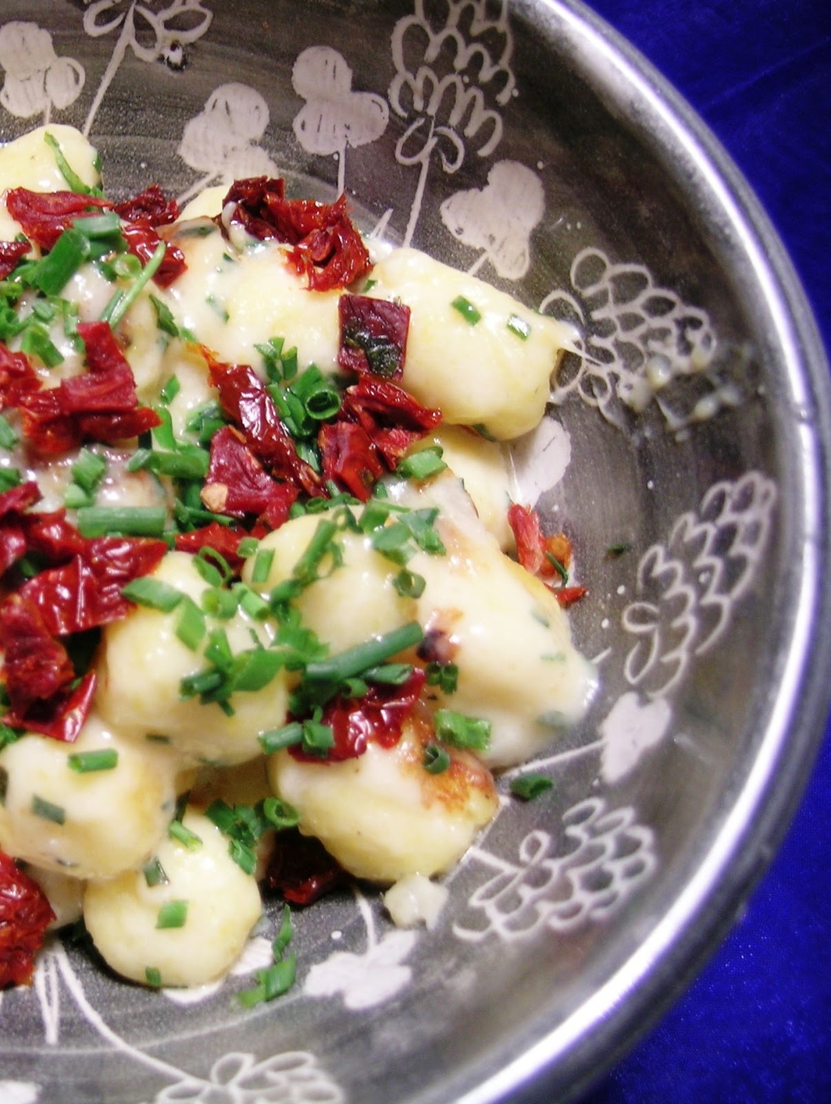 A krumplit megfőzzük. (Kicsit többet főzzünk, mert az adag hámozva értendő). Melegen meghámozzuk és lereszeljük, majd hozzákeverjük a liszteket, és összegyúrjuk. Szükség esetén adjunk még hozzá lisztet. Sózzuk és kicsit állni hagyjuk 5-10 percet. Majd 8 részre szedjük és kígyókat formázunk (ahogy Fanni mondaná), kb. 2 cm-nyi magasságú rudak legyenek belőle. Éles késsel 2-3 cm-es darabra vágjuk, és kb. 15 percig pihentetjük. Ezután forrásban lévő vízben kifőzzük. Amikor feljön a víz tetejére, elkészült: szűrővel szedjük ki, mossuk le hideg vízzel és olajozott edénybe rakva tároljuk. A szósz általában paradicsomos szokott lenni, ha nincsen otthon paradicsom, kevés olaj és víz keverékén megpároljuk a hagymát, majd hozzáöntjük a tejszínt, sózzuk, és belekeverve a metélőhagymát lezárjuk. Aszalt paradicsommal megszórva, és a szósszal meglocsolva tálaljuk a gnocchi-kat.