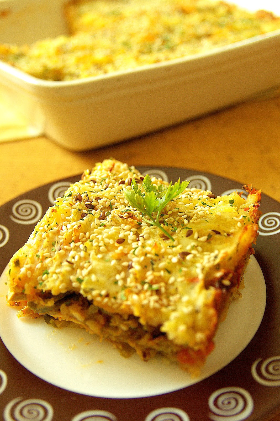 Egy közepes tepsit kiolajozunk, beletesszük alulra a püré felét, ráterítjük az egész zöldségpörköltöt, majd befedjük pürével. Megszórjuk magokkal, és 190 fokon kb.30 perc alatt összesütjük.
